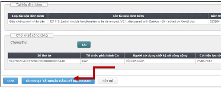Bước 2: Nhấn nút [Kích hoạt Tài khoản ĐKKD] để gửi yêu cầu kích hoạt tài khoản. Sau khi Quản trị viên xác nhận yêu cầu kích hoạt lại, Tài khoản ĐKKD sẽ hoạt động trở lại.